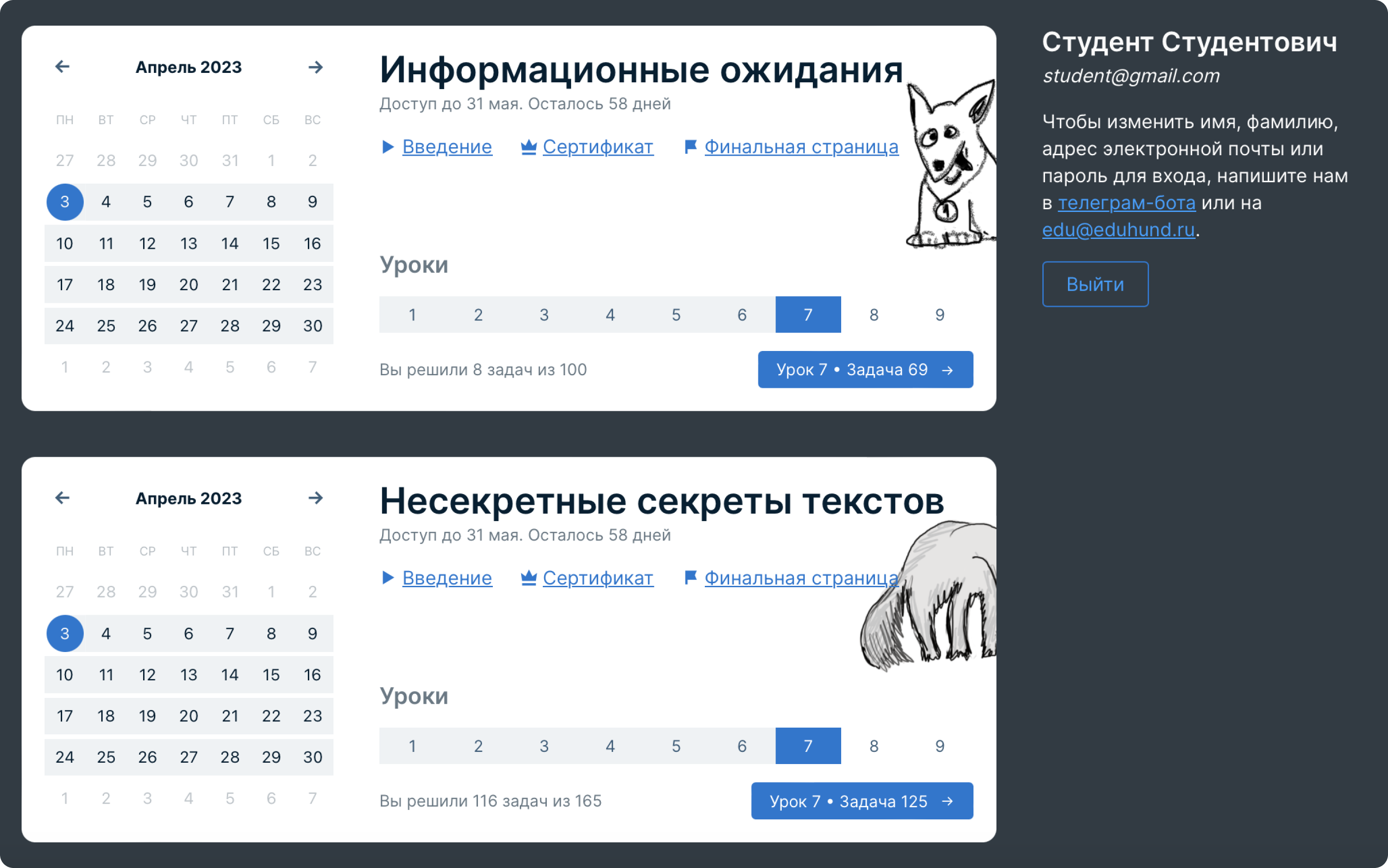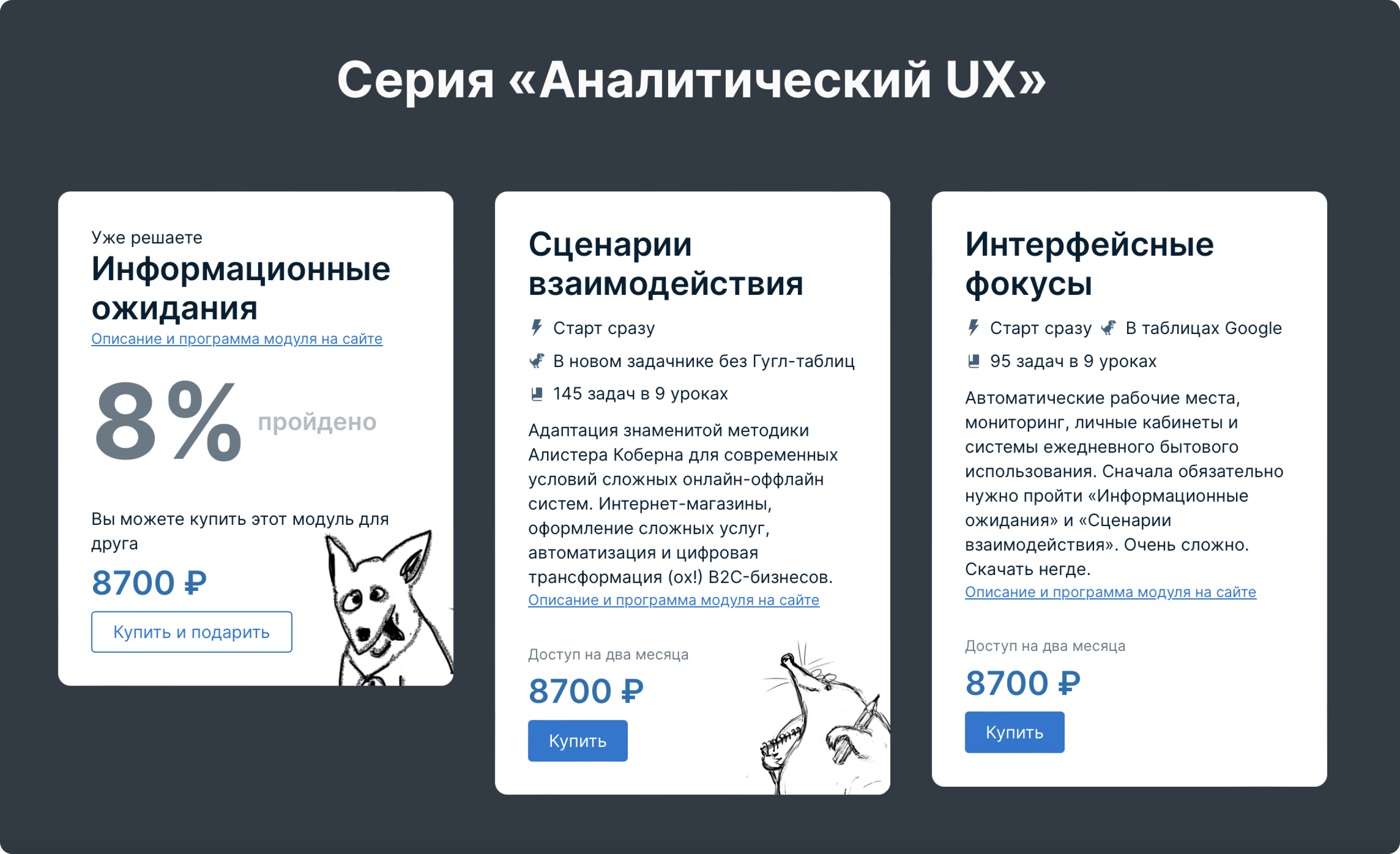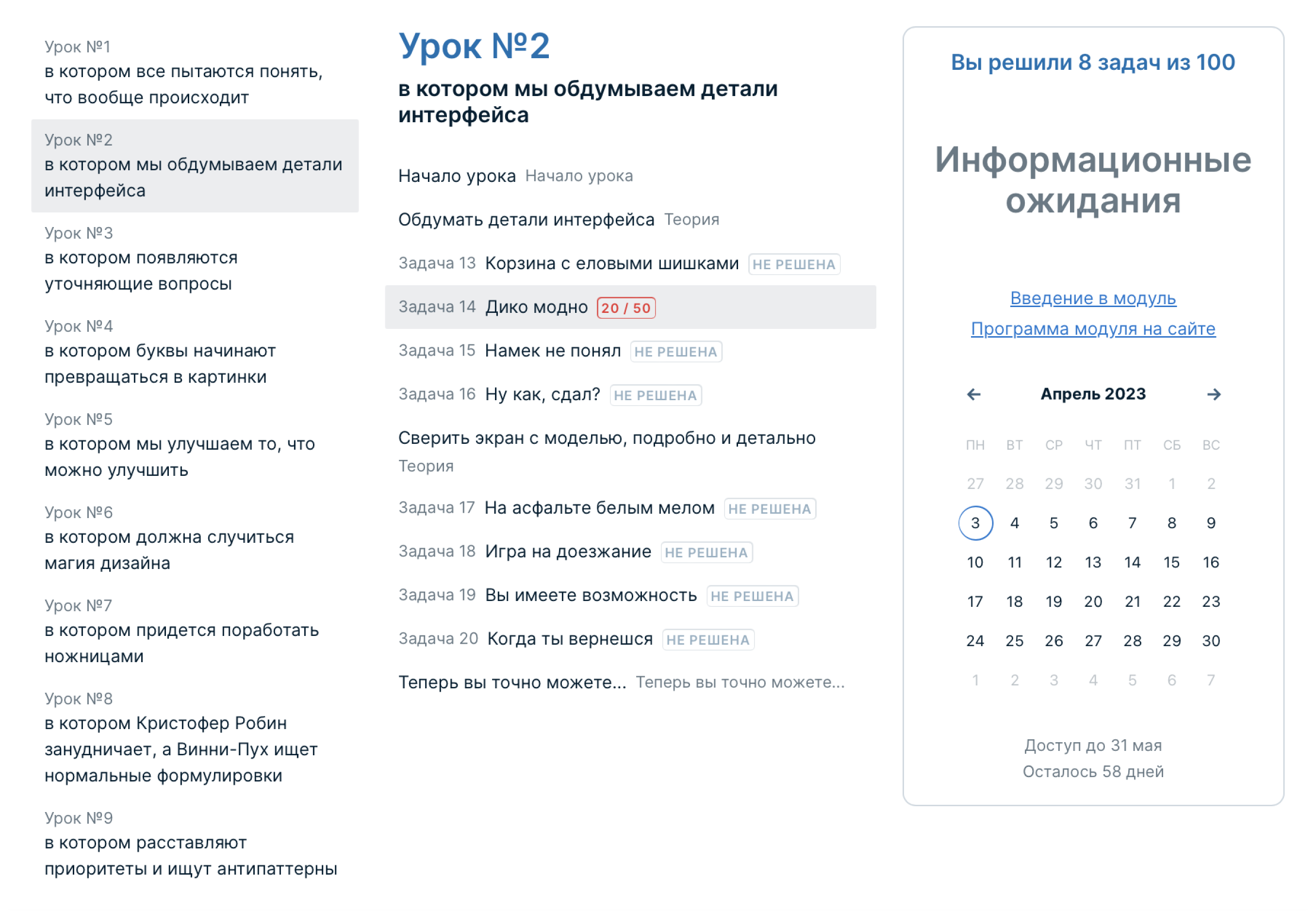 Модули «Информационные ожидания», «Сценарии взаимодействия» и «Интерфейсные фокусы» можно проходить только последовательно. Остальные модули независимы.