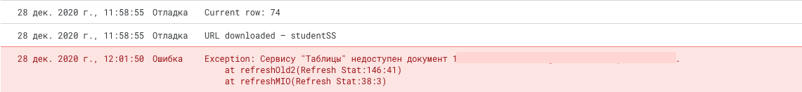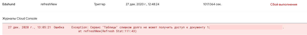 Скрипт выполняется только 30 минут. Иногда чуть больше, но мы списали это на погрешность времени запроса к файлам. Когда скрипт отработал полчаса — он просто останавливается, а в консоли появляется соответствующая ошибка. Если скрипт перезапустить, он начнет работу с начала. Возможности перезапустить скрипт и продолжить выполнение мы не нашли.