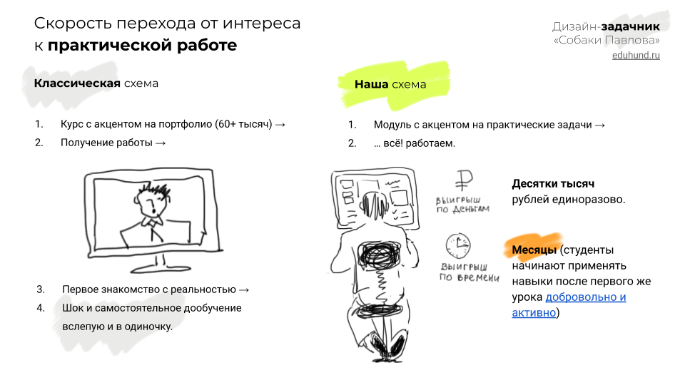 Выигрыш по времени: неудобные вопросы (и следующая из них коррекция продуктового курса) появляются уже после первого урока.