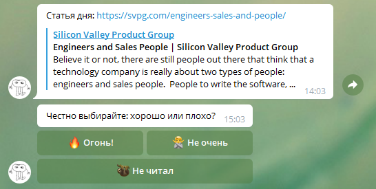 Что делать дальше со статьей — решать вам: полистать, прочитать или проигнорировать. Бот все понимает и не осуждает, но мнение спрашивает.