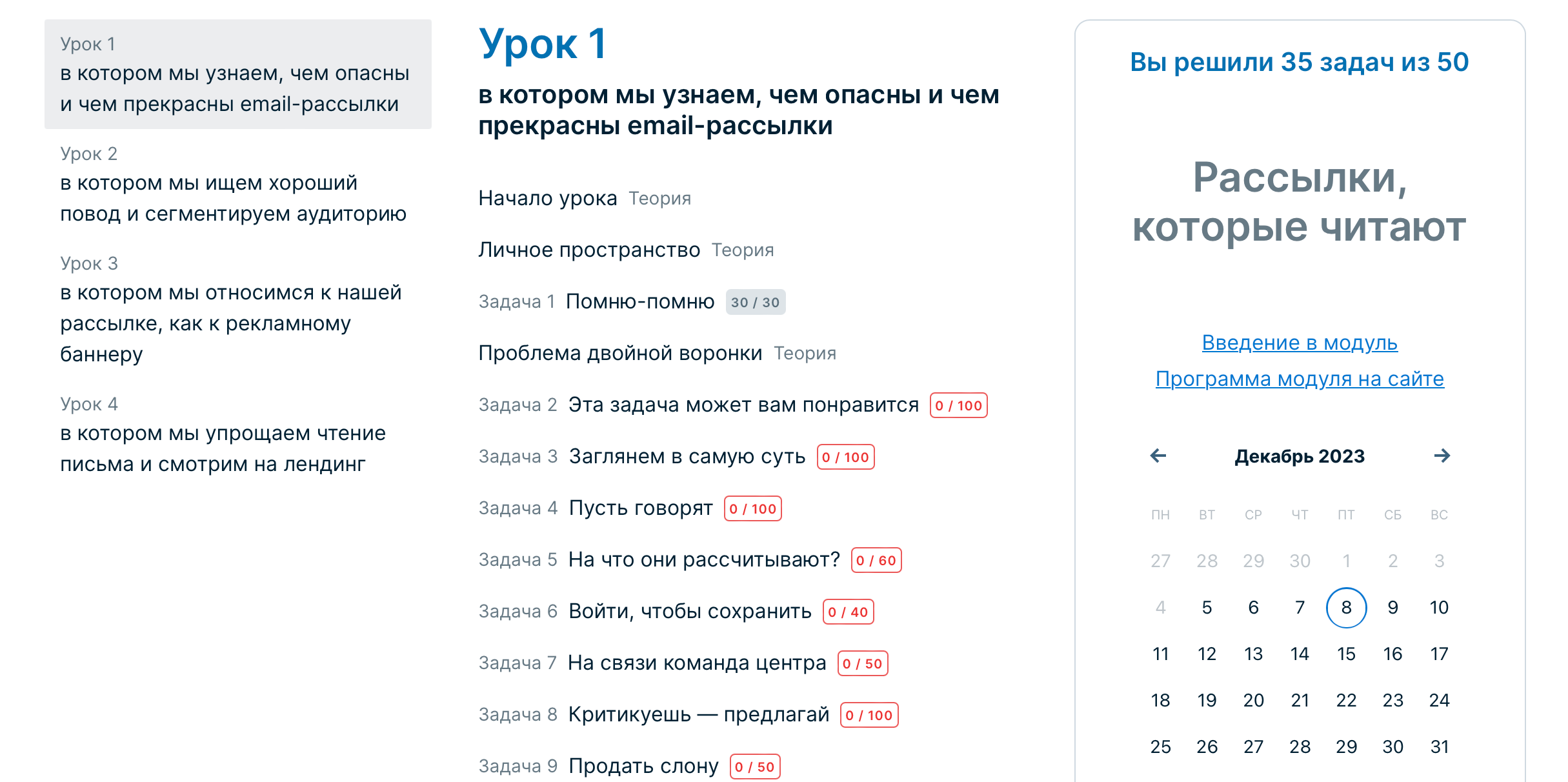 В этом модуле вы платите за возможностью получить или улучшить практические навыки email-маркетинга на конкретных примерах реально существующих рассылок.